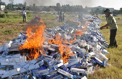 Lực lượng chức năng tiêu hủy thuốc lá nhập lậu. Ảnh: M.THI