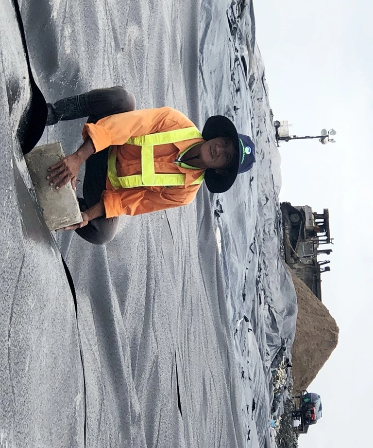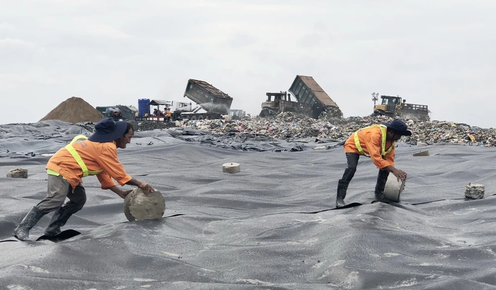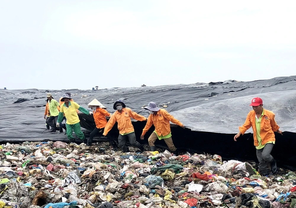 Nhóm công nhân đang kéo bạt ngay sau khi rác được lu đầm, phun khử mùi