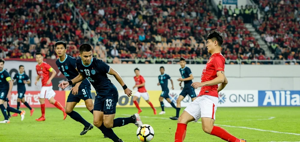 Buriram (áo xanh đen) có khởi đầu cực tốt khi cầm hòa 1-1 với Guangzhou Evergrande tại Trung Quốc.