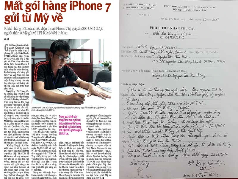 Trước đó, ngày 15-6, Pháp Luật TP.HCM có đăng bài “Mất gói hàng iPhone 7, Bưu điện TP.HCM nói gì?” thông tin chị ông Học ở Mỹ gửi về Việt Nam cho ông chiếc điện thoại iPhone 7 qua đường bưu điện ngày 30-12-2016 với hình thức chuyển phát thường. Ông Học chờ hơn một tháng vẫn không thấy bên bưu điện giao hàng. Sau nhiều lần liên hệ với phía bưu điện, đơn vị này xác định gói hàng của ông đã bị mất và sẽ bồi thường 200 USD cho người gửi và không giải thích gì thêm.