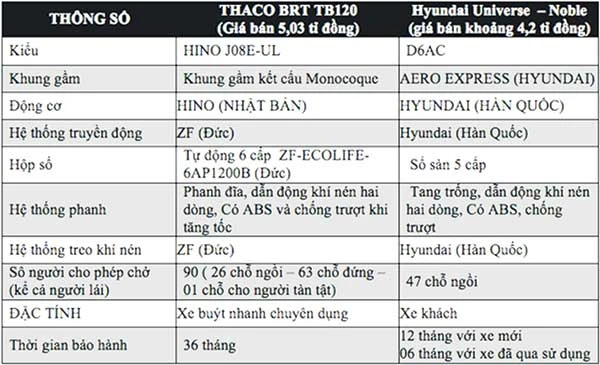 Bảng so sánh thông số kỹ thuật giữa xe buýt BRT và mẫu xe Hyundai Universe - Noble 410PS, loại xe khách 47 chỗ đắt nhất Việt Nam hiện nay với giá khoảng 4,2 tỉ đồng/chiếc. (Ảnh do Trường Hải - Thaco cung cấp)