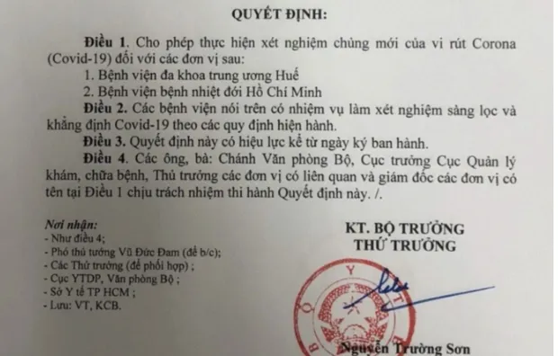 Quyết định của Bộ Y tế cho phép BV Bệnh nhiệt đới TP.HCM xét nghiệm COVID-19. Ảnh: TRẦN NGỌC
