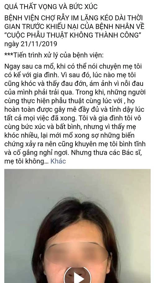Ngày 25-11, trên mạng xã hội Facebook xuất hiện thông tin con gái bệnh nhân PTTP (sinh năm 1966, ngụ Kiên Giang) tố BV Chợ Rẫy. Thông tin cho rằng BV đã tắc trách khi mổ nội soi cắt túi mật cho bà P. mà không gây mê, dẫn tới bà P. phải chịu đau suốt ca mổ ngày 22-11.