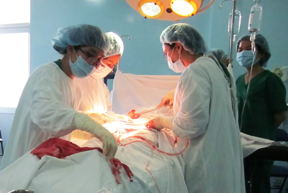 Các bác sĩ đang mổ cấp cứu sản phụ vỡ thai ngoài tử cung. Ảnh: TRƯỜNG GIANG