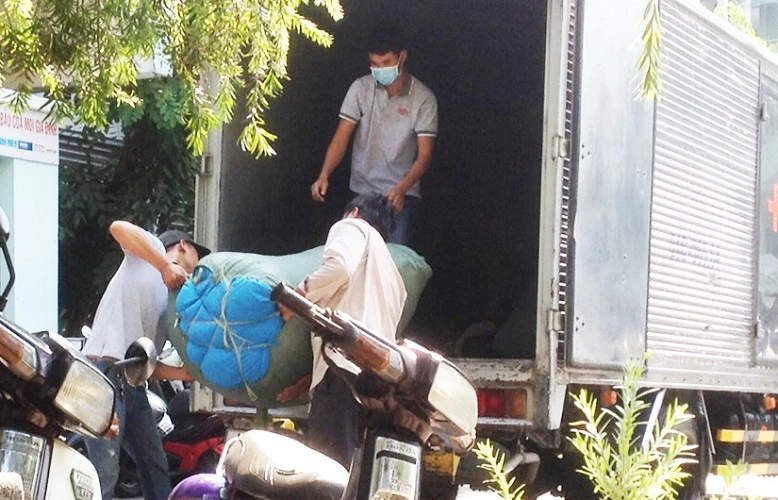 Nhân viên BV An Bình chuyển quần áo dơ đi xử lý. Ảnh: Trần Ngọc