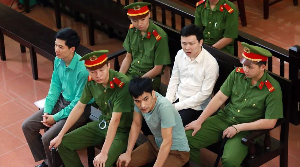 Các bị cáo tại phiên tòa sáng nay. Ảnh: VIẾT LONG