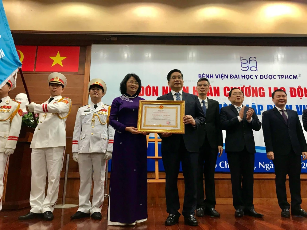 PGS-TS-BS Nguyễn Hoàng Bắc, Giám đốc BV, đón nhận huân chương Lao động hạng Nhất do Phó Chủ tịch nước Đặng Thị Ngọc Thịnh trao tặng. Ảnh: HL