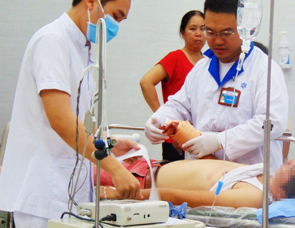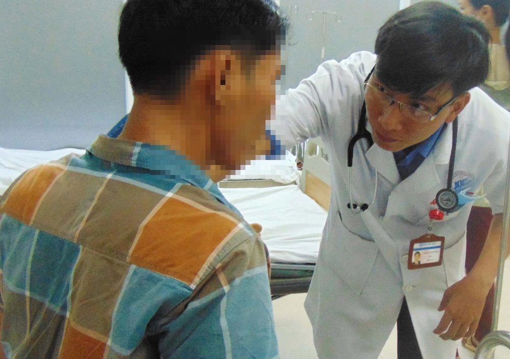 BS Dương Thanh Tùng đang khám người thanh niên uống thuốc luôn vỏ. Ảnh: TRẦN NGỌC