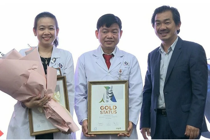Ông Nguyễn Huy Thắng (bìa phải) trao chứng nhận chất lượng điều trị vàng cho BV Nhân dân Gia Định. Ảnh: LÊ PHƯƠNG