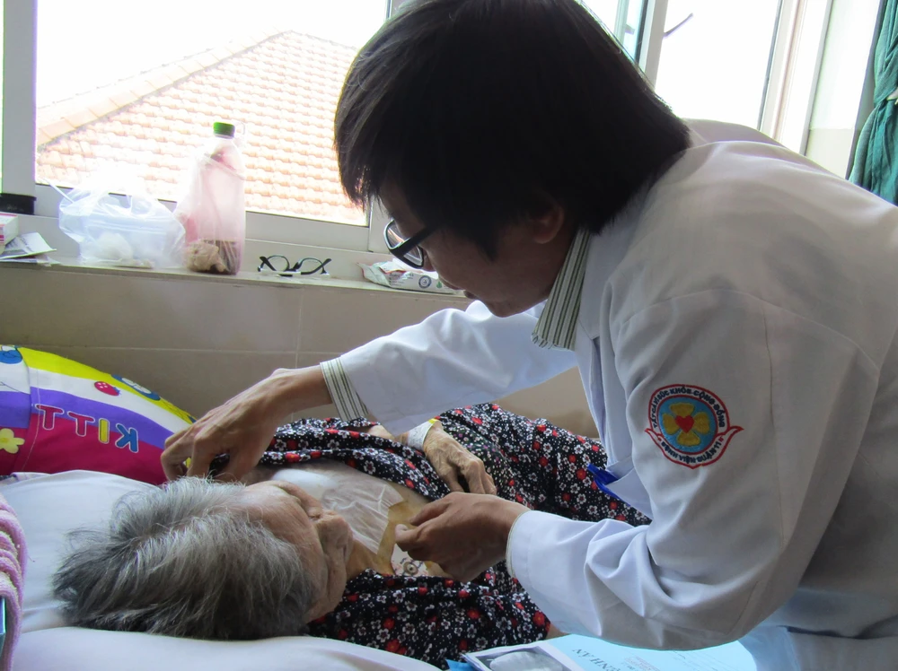 Bác sĩ thăm khám bà A. sau khi phẫu thuật. Ảnh: NGỌC DIỄM