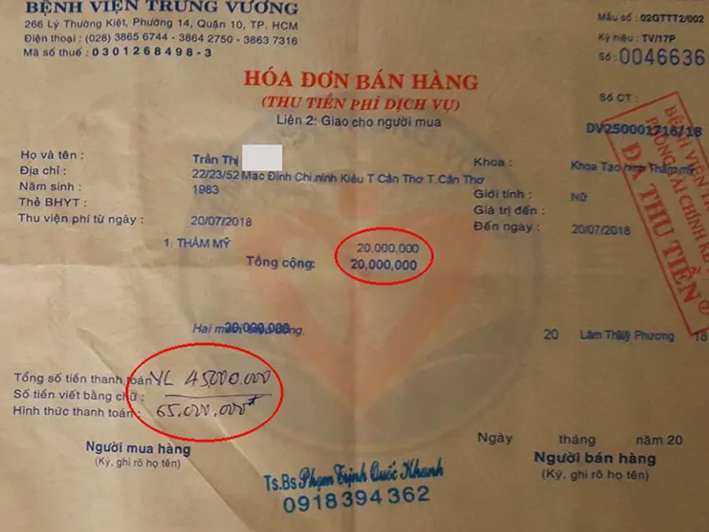 Có bệnh nhân Trần Thị Kim Q. (ngụ TP Cần Thơ) đóng 20 triệu đồng nhưng trong hóa đơn cũng chỉ in thể hiện 8 triệu đồng, còn trong hóa đơn giao cho bệnh nhân thì được viết thêm “12.000.000đ = 20.000.000đ”. Cũng bệnh nhân này, ngày 20-7 đến đóng 65 triệu đồng tiền làm ngực, trong hóa đơn in ra là 20 triệu đồng nhưng ở phần “Tổng số tiền thanh toán” được viết thêm bằng bút bi “45.000.000đ”. Cộng cả hai số tiền in từ hóa đơn và số tiền viết tay thì đúng với số tiền 65 triệu đồng mà bệnh nhân đóng cho BV…