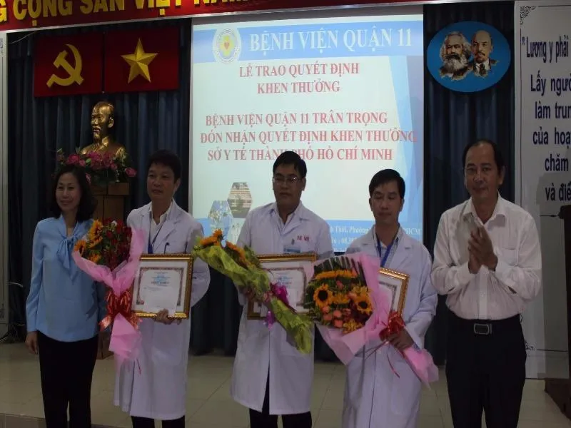 BS Tăng Chí Thượng, Phó Giám đốc Sở Y tế TP.HCM, trao bằng khen cho BS Phạm Quốc Dũng, Giám đốc BV quận 11, BS CKI Phạm Thanh Vũ, phụ trách khoa ngoại chấn thương, BS CK1 Nguyễn Hữu Nghiệm, khoa gây mê hồi sức (từ trái qua phải).