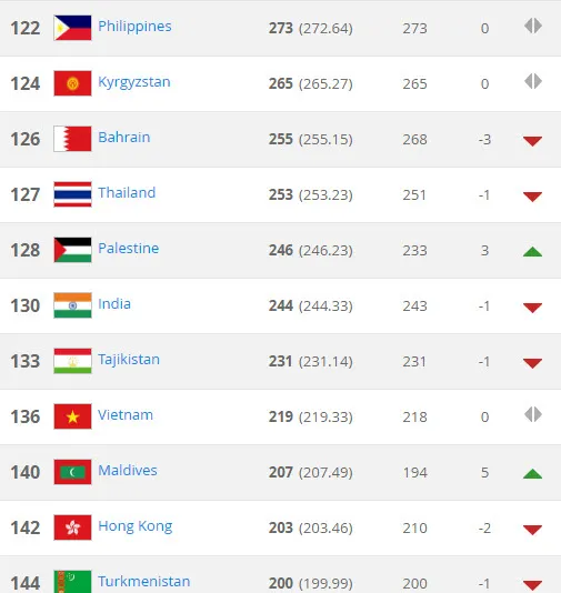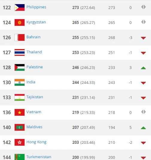 Khu vực Đông Nam Á, đáng chú ý Indonesia đã vượt qua Campuchia lên đứng số… 8 khu vực. Việt Nam vẫn tịnh tiến ở vị trí thứ 3 khu vực. Các đội trong tốp 10 Đông Nam Á gồm Philippines dẫn đầu, tiếp theo là Thái Lan, Việt Nam, Myanmar, Malaysia, Singapore, Lào, Indonesia, Campuchia, Brunei và Đông Timor.