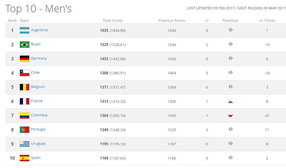 Theo đó, tốp 10 đội bóng xuất sắc nhất thế giới vẫn không có nhiều thay đổi. Argentina vẫn là đội bóng xuất sắc nhất thế giới, theo sau là Brazil, Đức, Chile, Bỉ. Thay đổi duy nhất trong tốp 10 so với tháng trước là Colombia và Pháp đổi chỗ cho nhau.