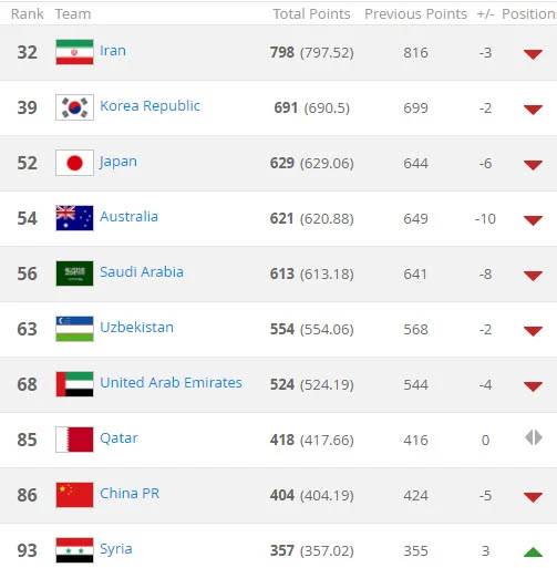 Ở khu vực châu Á, trong tháng vừa qua, hầu hết các đội trong tốp 10 đều bị giảm điểm và tụt hạng. Sau khi bị Úc vượt mặt tháng trước, Nhật Bản đã tái chiếm vị trí thứ ba châu Á, sau Iran và Hàn Quốc. Các đội còn lại nằm trong tốp 10 châu Á là Úc, Saudi Arabia, Uzbekistan, UAE, Qatar, Trung Quốc và Syria.