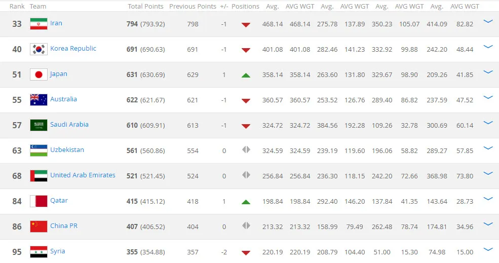 Top 10 đội xuất sắc nhất châu Á cũng tương tự khi Iran, Hàn Quốc, Nhật Bản, Úc và Saudi Arabia chia nhau năm vị trí dẫn đầu. Các đội còn lại trong tốp 10 là Uzbekistan, UAE, Qatar, Trung Quốc và Syria.