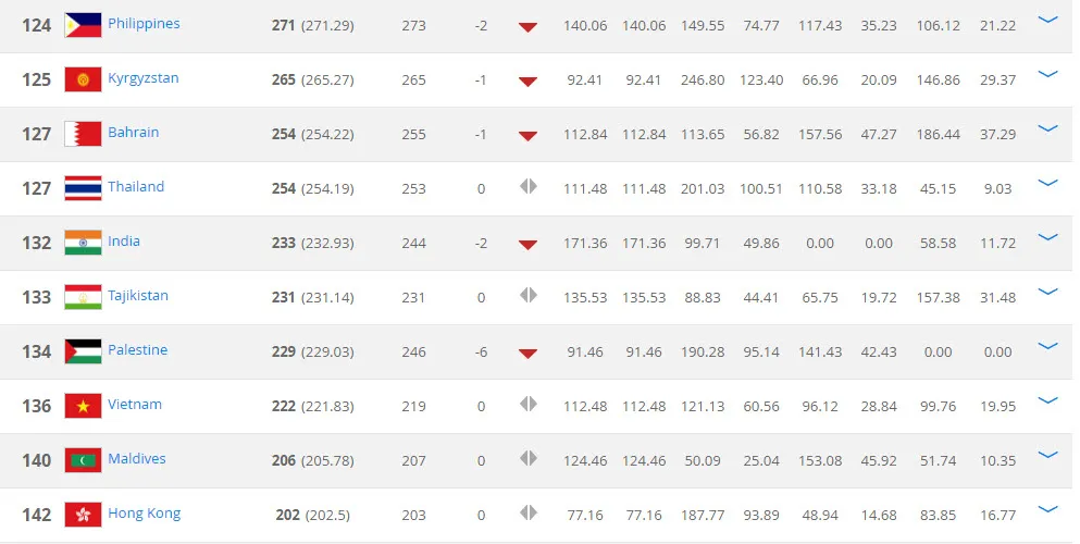Khu vực Đông Nam Á thì Philippines, Thái Lan, Việt Nam vẫn chiếm ba vị trí dẫn đầu. Đội tuyển Việt Nam đang có 222 điểm, đứng vị trí 136 thế giới.
