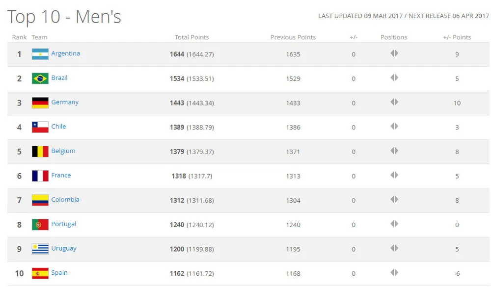 Cụ thể, Argentina vẫn là đội bóng xuất sắc nhất thế giới. Các đội còn lại nằm trong tốp 10 lần lượt là Brazil, Đức, Chile, Bỉ, Pháp, Colombia, Bồ Đào Nha, Uruguay, Tây Ban Nha.