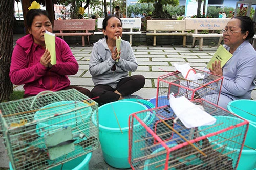 Chim và cá được mua từ trước đó và được thả sau khi người dân làm lễ cúng bái.