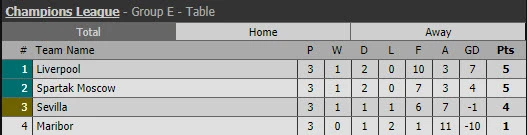 Đây là trận thắng đầu tiên của Liverpool ở Champions League mùa này nhưng chừng đó là đủ giúp họ vượt lên vị trí đầu bảng với 5 điểm, Spartak Moscow đứng thứ hai cùng 5 điểm nhưng thua hiệu số, Sevilla đứng thứ ba với 4 điểm, còn Maribor xếp cuối với 1 điểm.