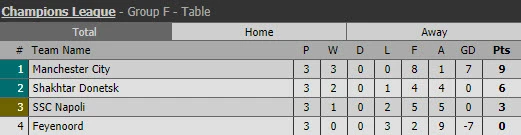 Ở trận còn lại, chủ nhà Feyenoord thua Shakhtar Donetsk 1-2. Bảng này, Man. City dẫn đầu với 9 điểm, các vị trí tiếp theo thuộc về Shakhtar Donetsk 6 điểm, Napoli 3 điểm và Feyenoord 0 điểm.