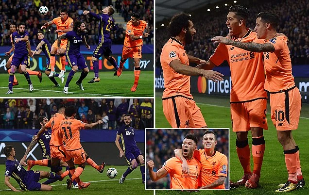 Trong khi đó, đoàn quân đỏ Liverpool còn thắng đậm hơn khi họ đè bẹp chủ nhà Maribor đến 7-0. Chỉ trong hiệp 1, Liverpool đã có bốn bàn thắng nhờ công của Firmino, Coutinho và cú đúp của Salah. Sang hiệp 2, Firmimo, Alex Oxlade-Chamberlain và Trent Alexander-Arnold ghi thêm ba bàn nữa giúp Liverpool thắng 7-0.