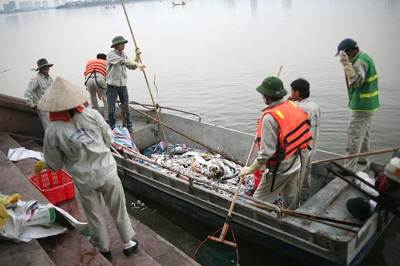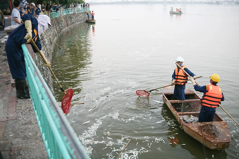 Trước tình hình trên, Chủ tịch UBND TP Hà Nội yêu cầu Công an TP hỗ trợ thêm xuồng của lực lượng CSGT đường thủy; các lực lượng khác huy động thêm người, trưng dụng lưới để vớt nhanh số cá chết trên mặt hồ.