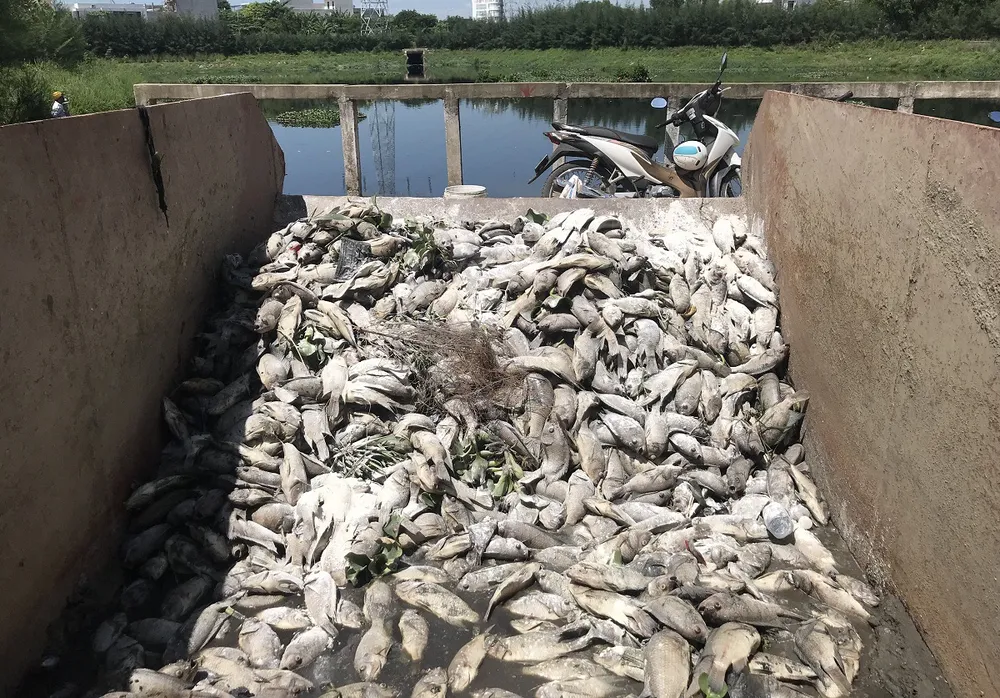 Một tấn cá chết được vớt lên với mùi hôi thối nồng nặc. Ảnh: HẢI HIẾU