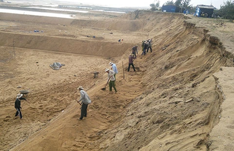 Người dân đang lấn chiếm đất rừng phòng hộ làm hồ nuôi tôm tại xã Hòa Hiệp Nam. Ảnh: TẤN LỘC