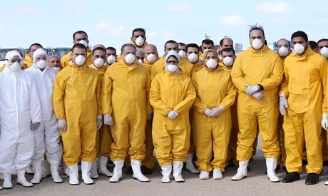 Bộ trưởng Y tế Ai Cập Hala Zayed (giữa) cùng đội y bác sĩ tham gia đón các công dân trở về từ Vũ Hán đầu tháng này. Ảnh: AHRAM ONLINE