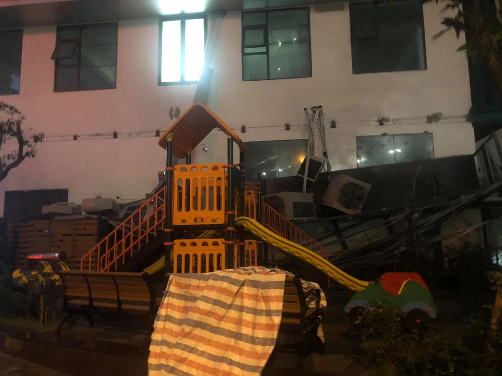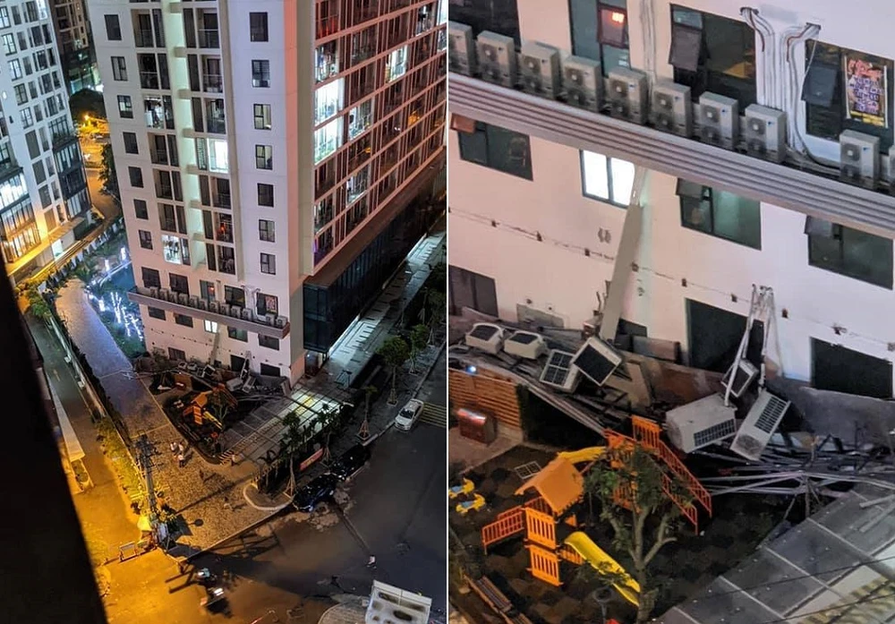 Thời điểm trên, một dàn điều hòa treo trên tường tầng 1 của chung cư bất ngờ bị sập, rơi xuống đất, cạnh khu vui chơi của trẻ em.