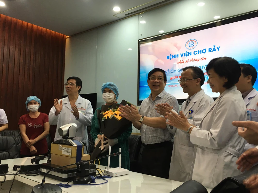 Lãnh đạo Cục Quản lý khám chữa bệnh và BV Chợ Rẫy chúc mừng bệnh nhân (người ôm hoa). Ảnh: HL
