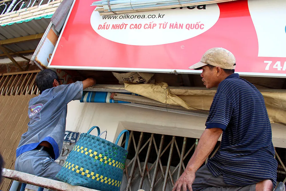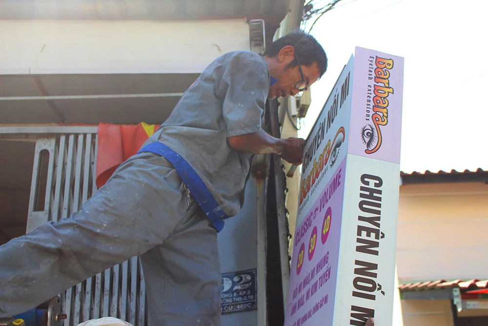 Sau đó còn dỡ cả biển quảng cáo... Ảnh: L.THOA