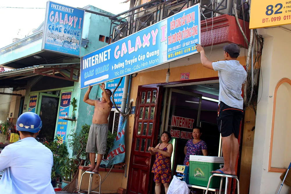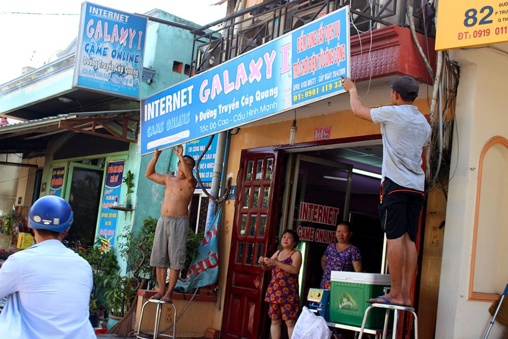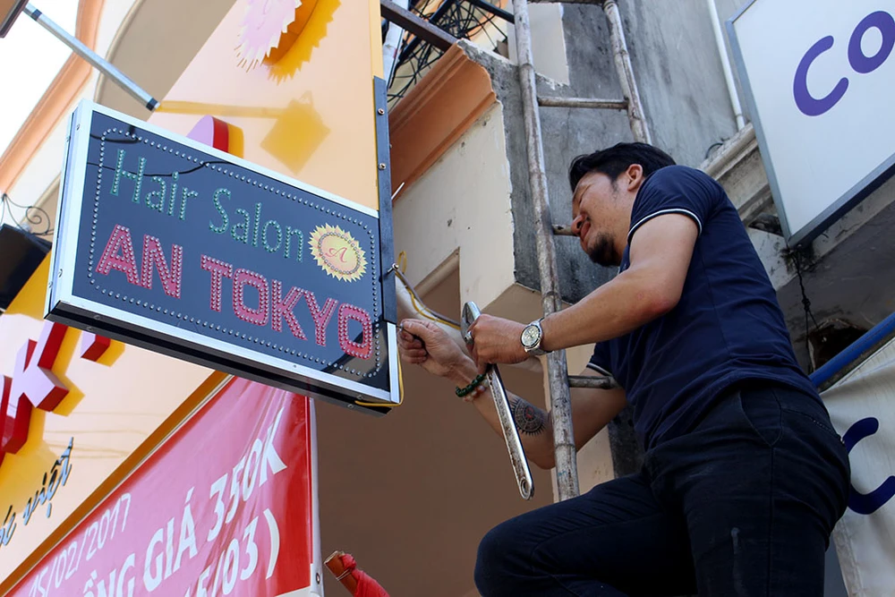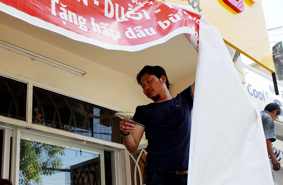 Chủ một tiệm làm tóc cũng tự nguyện dỡ biển hiệu của mình. Ảnh: L.THOA
