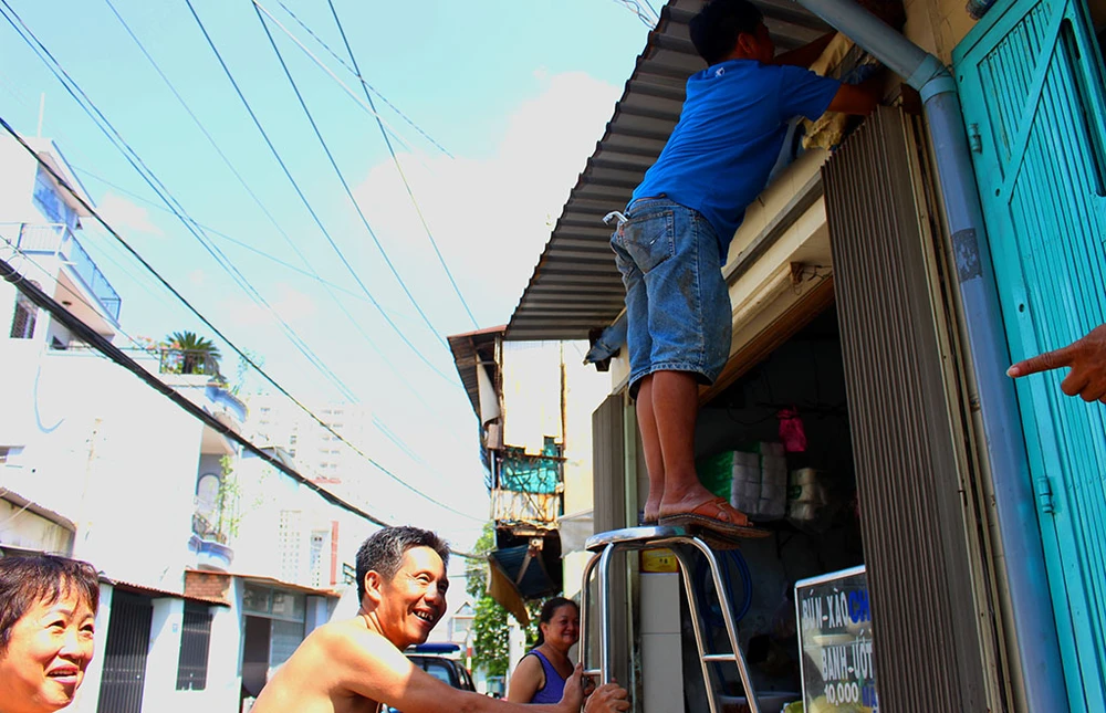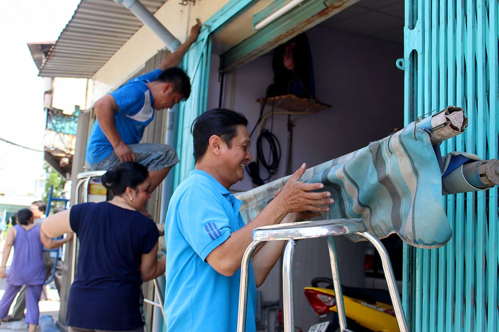 Vui vẻ tháo mái che trước nhà mình. Ảnh: L.THOA