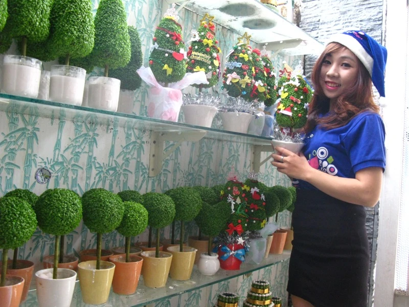 Đỗ Mai Châu, cựu sinh viên sư phạm vật lý - tin học tại Trường CĐ sư phạm Đắk Lắk rất yêu thích công việc kinh doanh cây cảnh. Đây là mùa Noel thứ 2 Mai Châu tiếp tục kinh doanh mặt hàng cây thông Noel mini phục vụ Giáng sinh.