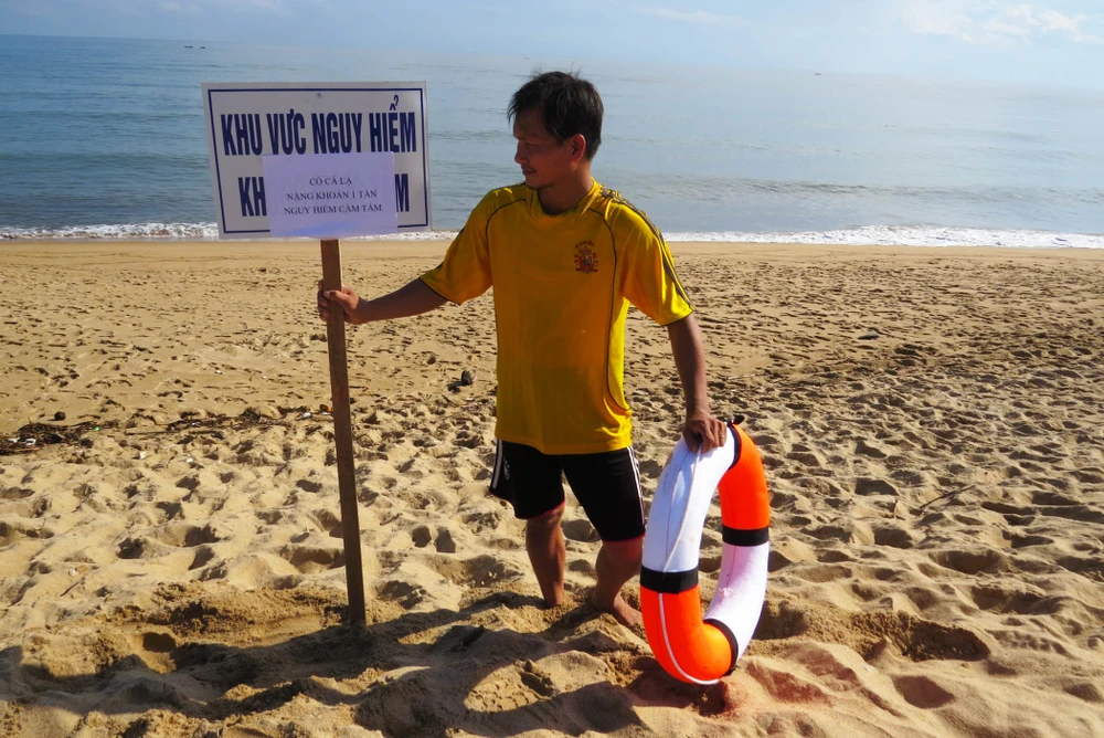 Nhân viên cứu hộ bờ biển Tuy Hòa dựng biển cấm tắm biển. Ảnh: TL