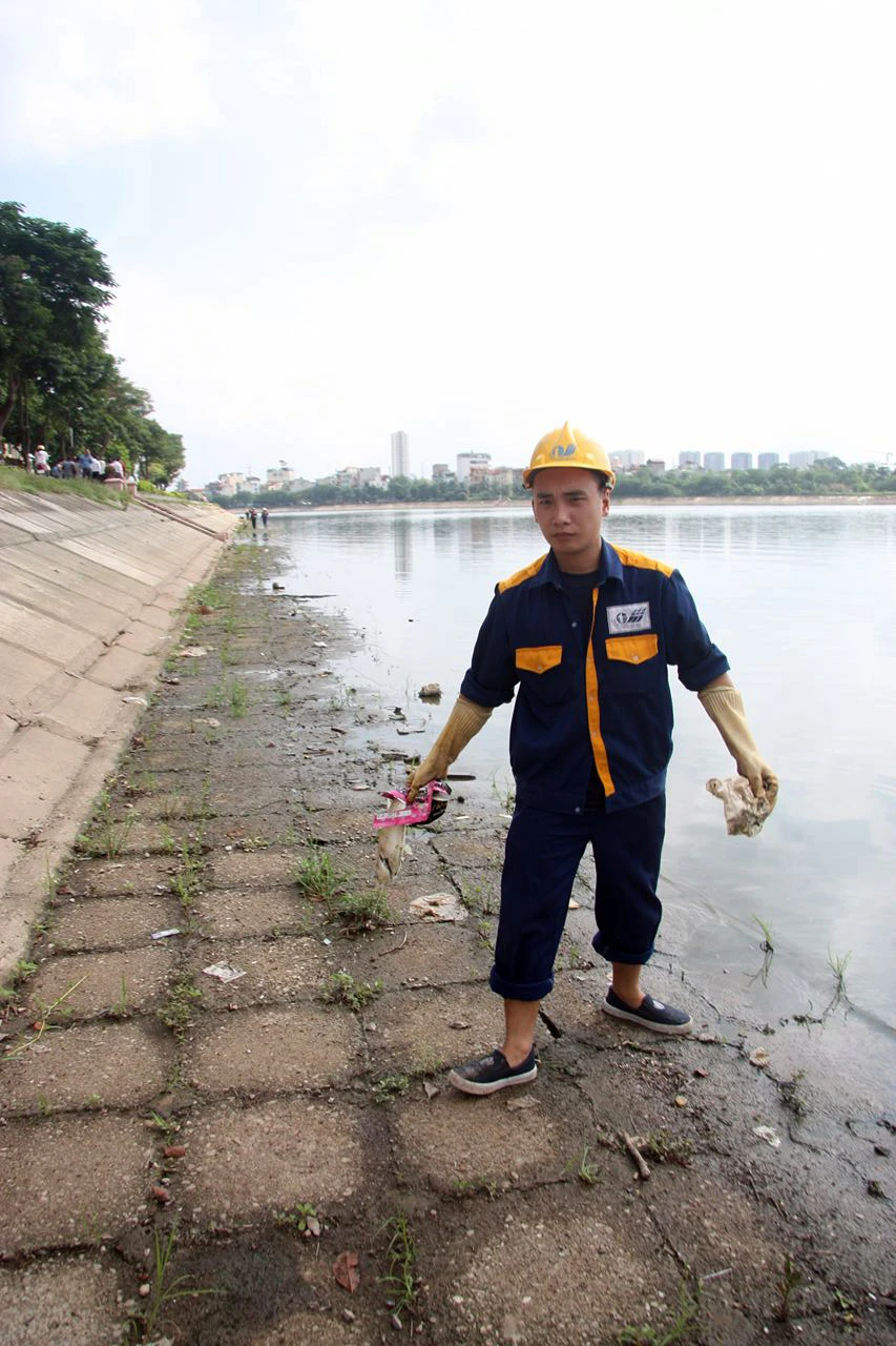Theo ghi nhận ở phía nam hồ Linh Đàm trong buổi sáng nay, các công nhân tiếp tục công việc vớt rác, vớt xác cá. Mùi hôi tanh từ mặt hồ vẫn bốc lên nồng nặc khiến người dân, người đi qua khu vực cảm thấy “nhức mũi”.
