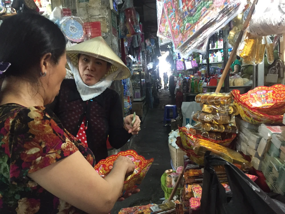 Bà Nguyễn Thị K., chợ Nguyễn Văn Trỗi kể từ cuối tuần đến ngày vía Thần tài bà bán được cả mấy ngàn bộ đồ cúng, có người mua hơn triệu đồng cho các vật phẩm cúng. Bộ đồ cúng Thần tài Thổ địa lớn có giá 20.000 đồng/bộ, bộ nhỏ hơn giá 5.000 đồng (bộ nhỏ này không có vàng 9999).