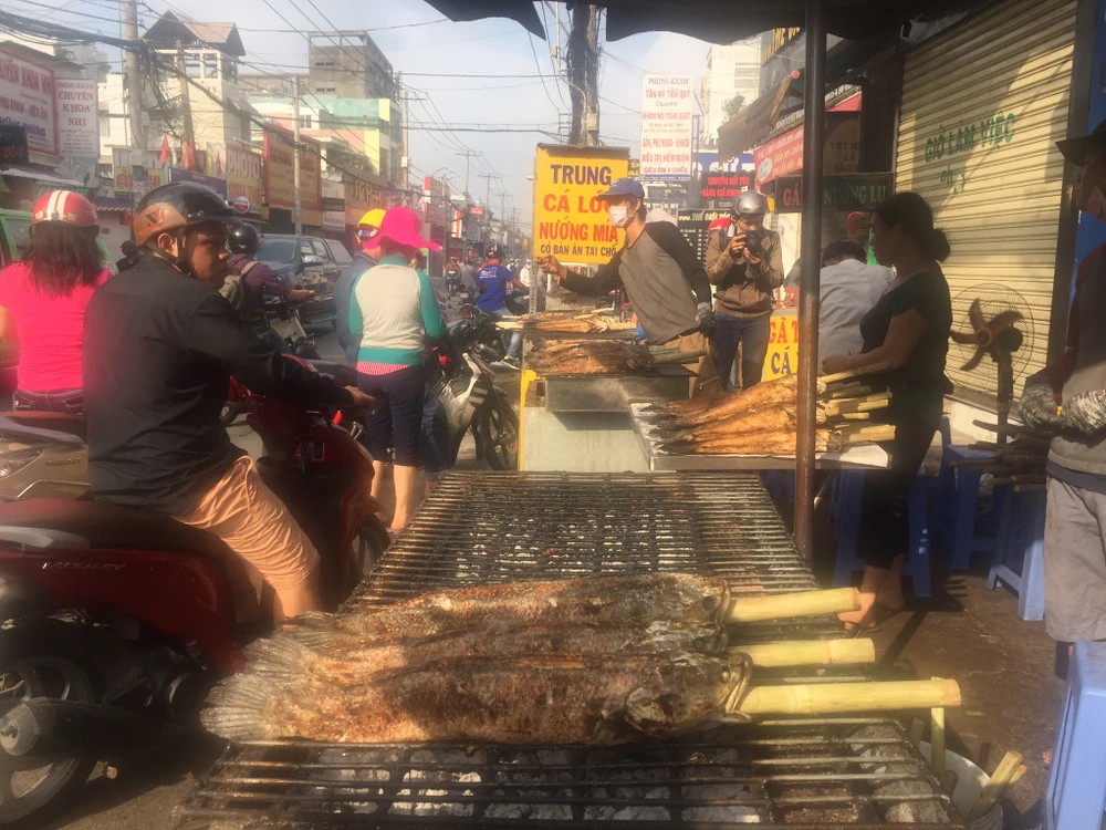 Tương tự tại khu vực đường Tân Kỳ Tân Quý (Tân Phú) các tiệm bán cá lóc nướng khói nghi ngút. Một tiệm bán cá lóc ở đây cho biết mấy ngày nay khách mua rất đông, hút hàng nên giá cá lóc tăng cao. Giá 130.000-150.000 đồng, “loại cao nhất 180.000 đồng/con vì nhiều người thích mua loại to” - anh T., nhân viên bán hàng, giải thích.