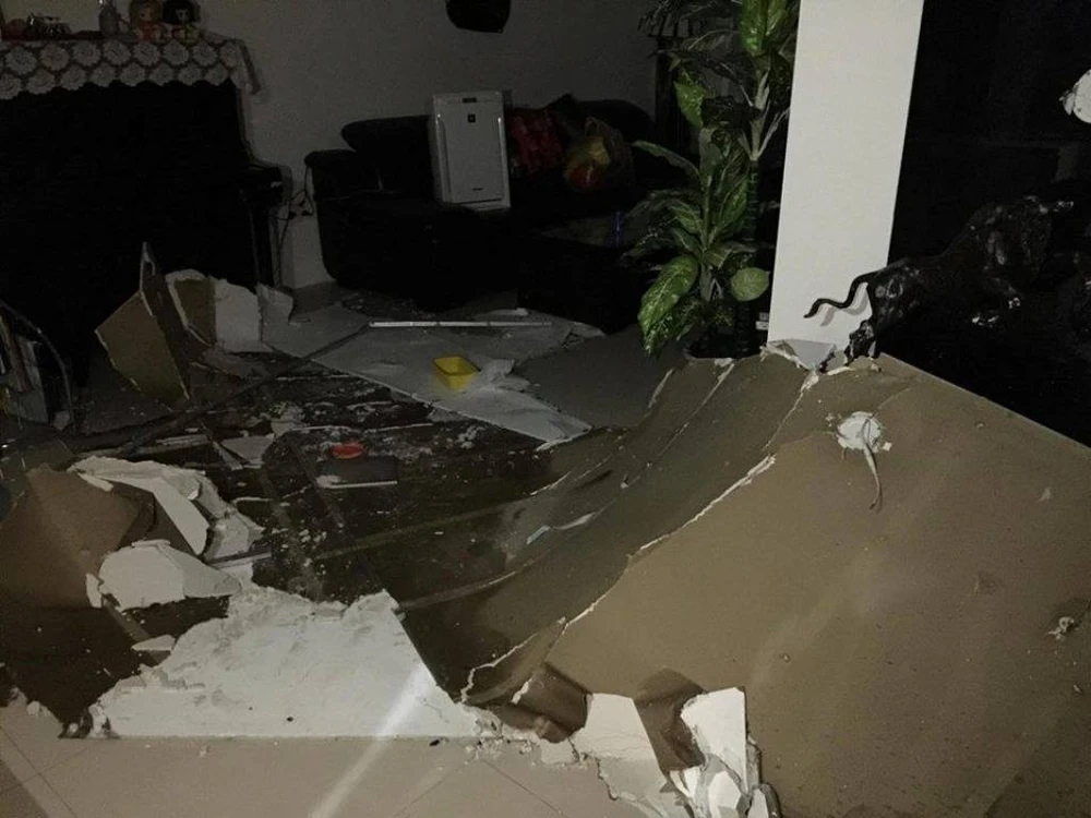 Hậu quả khiến căn nhà ngập trong nước, nhiều đồ đạc bị trần nhà rơi trúng dẫn tới vỡ hoặc hư hỏng. Hiện trường vụ việc cho thấy toàn bộ căn phòng đang ngổn ngang các vật liệu xây dựng rơi xuống.