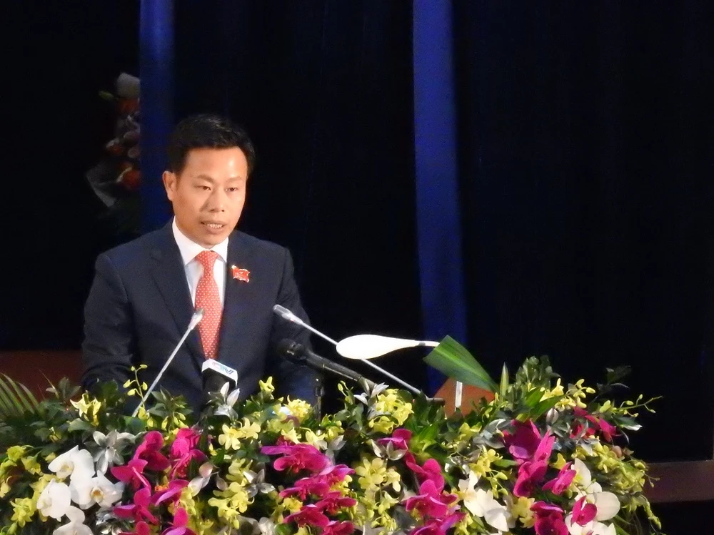 Ông Lê Quân, Phó bí thư, Chủ tịch tỉnh Cà Mau báo cáo Chính trị trước Đại Hội Đảng bộ tỉnh Cà Mau. Ảnh: TRẦN VŨ