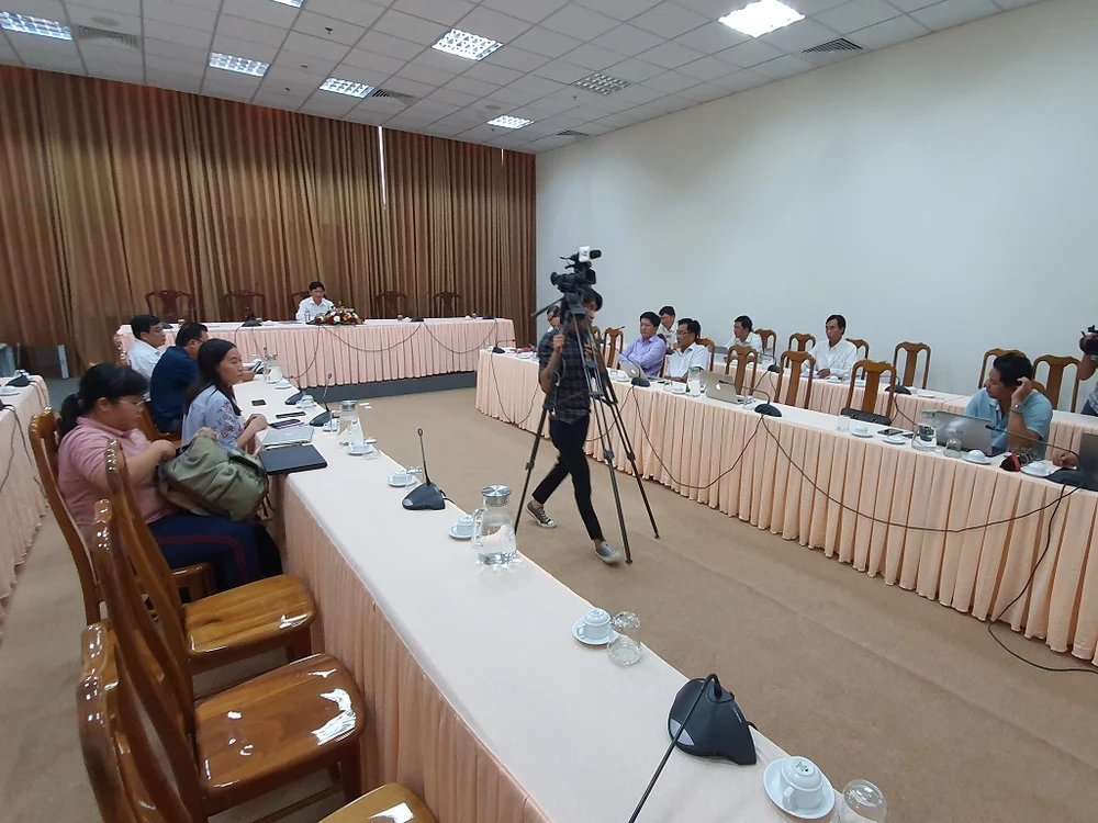 Ngay sau khi báo chí đăng tải thông tin sai phạm trăm tỉ trên đê biển Tây Cà Mau, UBND tỉnh Cà Mau tổ chức họp báo nóng nhưng chỉ thông tin không cho phóng viên hỏi (Trần Vũ).