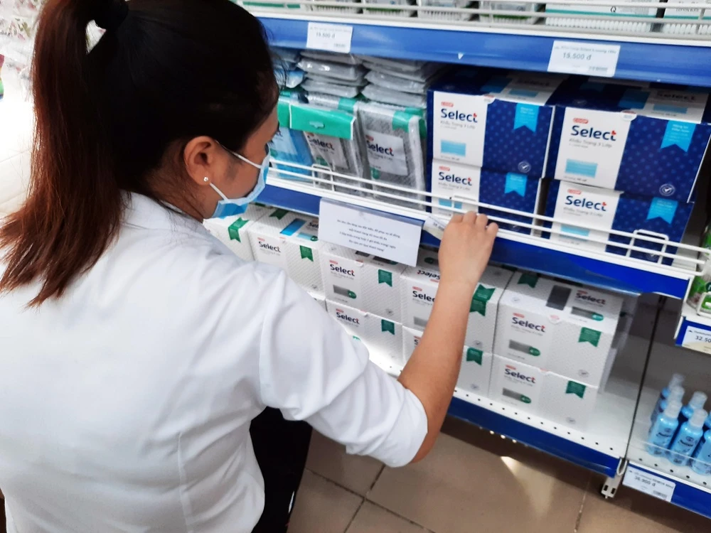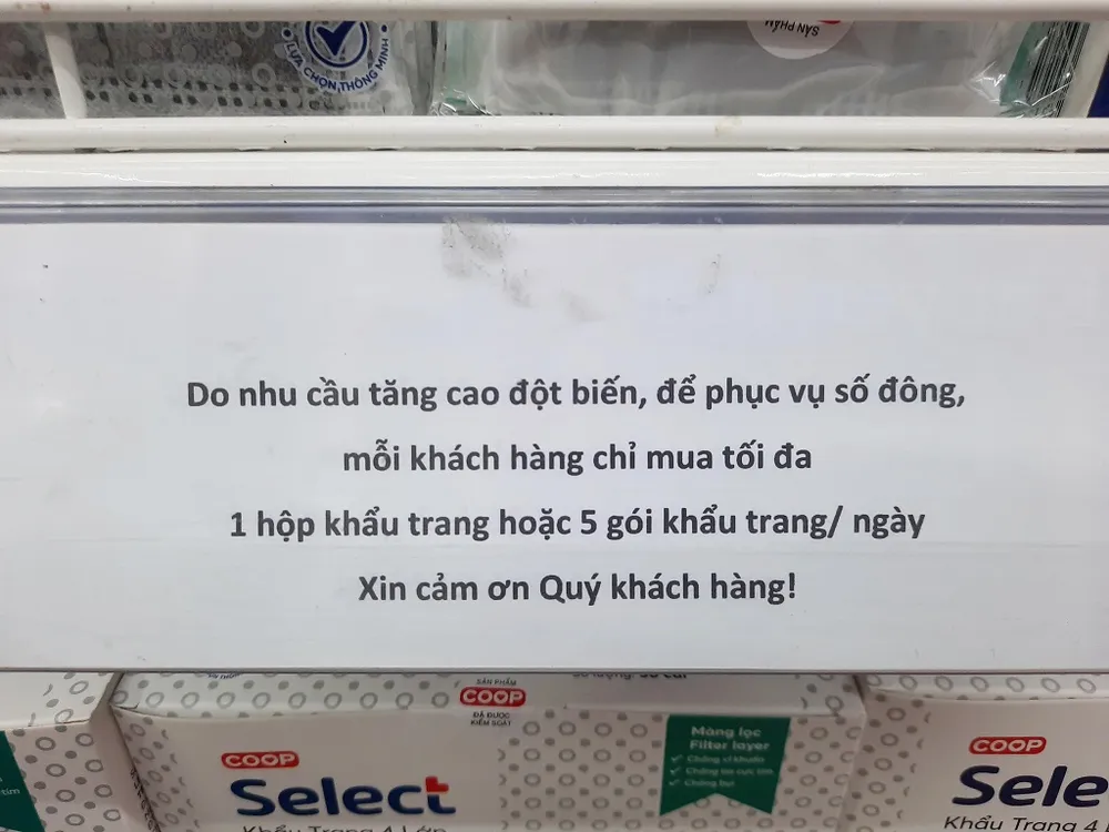 Tại quầy bán khẩu trang, chủ cửa hàng treo bản thông báo bán hạn chế vì cộng đồng (CTV).