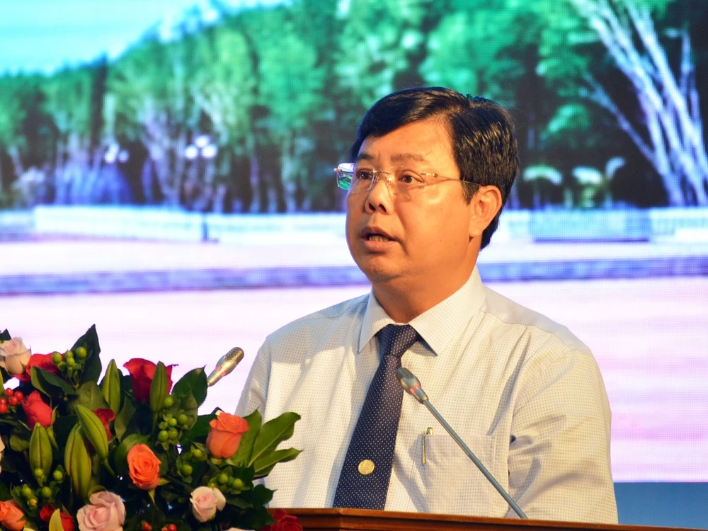 Chủ tịch UBND tỉnh Cà Mau Nguyễn Tiến Hải phát biểu tại buổi tổng kết sáng nay. Ảnh: CTV
