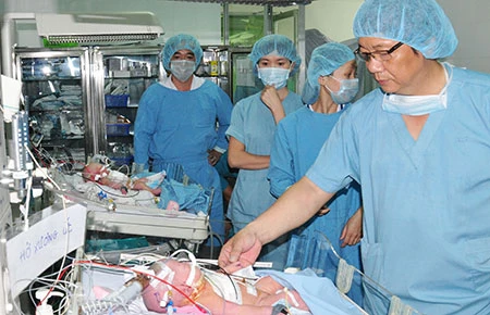 Sáng sớm 27-2, một lẵng hoa chúc mừng ngày Thầy thuốc Việt Nam được Ban Giám đốc BV Nhi đồng 1 đặt trước khu phòng mổ. TS-BS Nguyễn Thanh Hùng, Giám đốc BV Nhi đồng 1, đã đến bắt tay, động viên êkíp phẫu thuật. Đây có thể là ngày kỷ niệm 27-2 đáng nhớ nhất của tập thể y, bác sĩ BV Nhi đồng 1 bởi trong ngày đặc biệt của mình, họ đã cứu sống hai sinh linh bé bỏng đang nguy kịch.