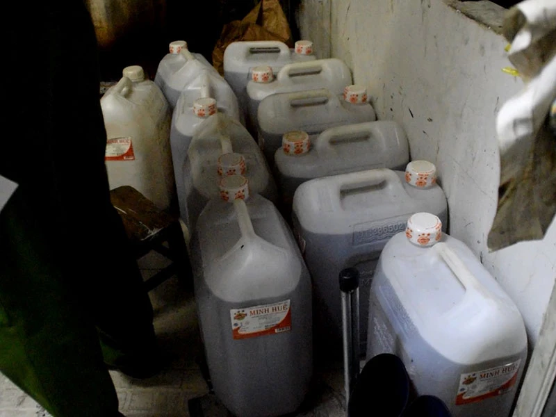 Tại đây, lực lượng chức năng phát hiện khoảng 1000 chai dầu mang nhãn hiệu Nakydaco loại 250ml, nhiều vỏ chai, tem nhãn và hàng chục thùng dầu được đựng trong các can nhựa cáu bẩn, mất vệ sinh. Tất cả dụng cụ ở đây đều đã đóng cặn, mảng đen kịt và bốc mùi khó chịu.