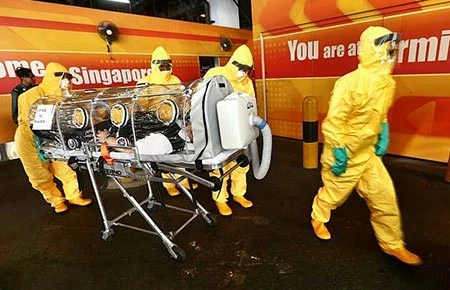 Singapore diễn tập chống Ebola ở sân bay Changi ngày 14-8. Ảnh: CAN