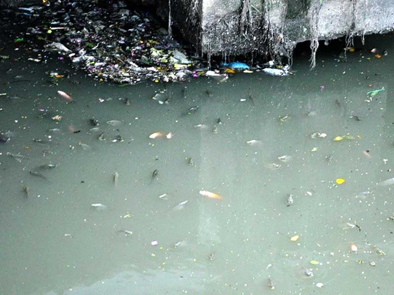 Cá đủ chủng loại nổi đầy kênh Nhiêu Lộc - Thị Nghè và cá đã chết rải rác. Ảnh: NGUYỄN TÂN