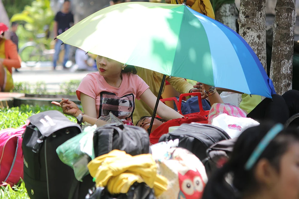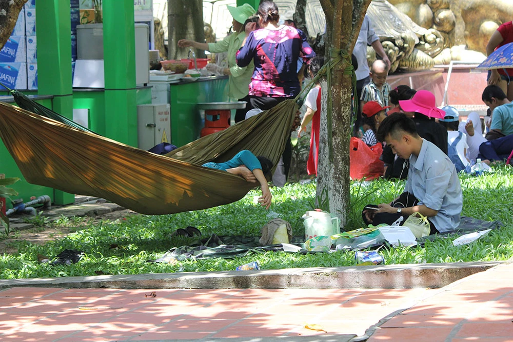 Đến trưa, các gia đình tranh thủ tìm nơi tá túc, nghỉ trưa dưới các tán cây xanh.